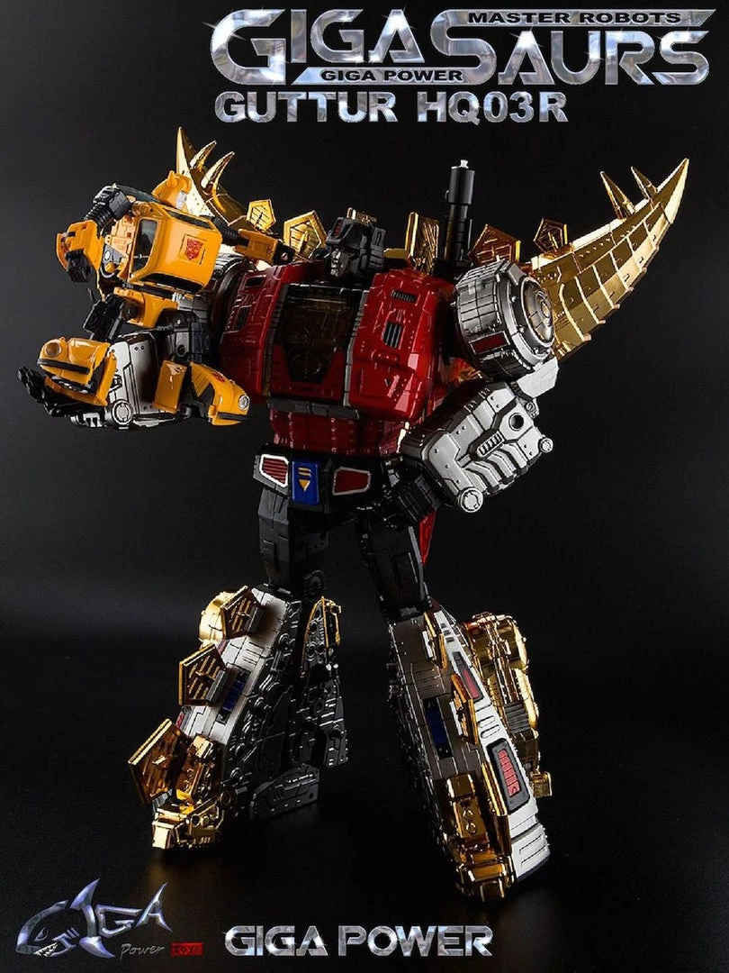New from GigaPower is their first entry into the third party dinobot world, HQ03 Guttur! GigaPower Guttur is a newly designed die-cast and plastic dinosaur robot figure! Guttur converts from a robotic Stegosaurus to robot and back. This version of GigaPower Guttur comes with chrome plated details over the original metallic finish. This second version features chrome detailing with the following accessories: 1. Gun2. canon3. sword4. transparent cap for head5. transparent cap for neck6. alternative face/head Picture is a placeholder while we wait for official images from GigaPower. More pictures to come!