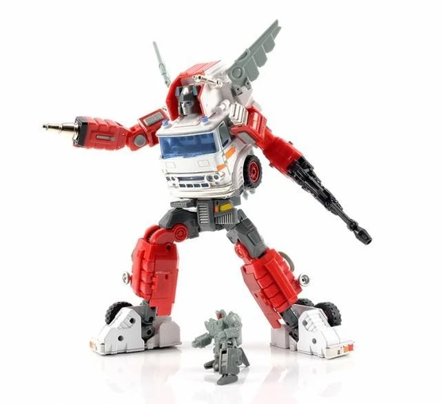 Convention exclusive recolor of PS-03 Backdraft in a white & red color. PS-08 Kojin comes with target warrior Nightbeam as well as weapons and accessories.